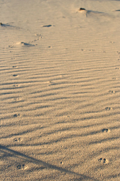 These look like kangaroo rat tracks. They're supposed to be abundant out in this area, but to find two sets matching each other stride for stride was interesting. I didn't want to say 'jogging buddy' but I was thinking it. | |