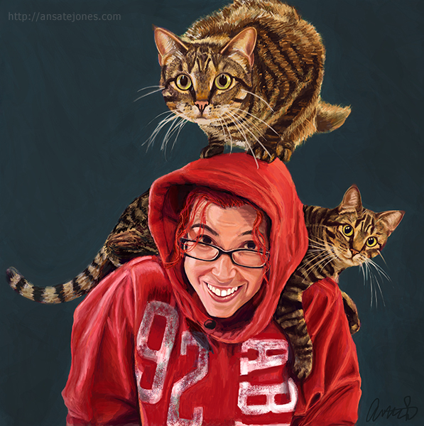 Commissioned portrait of my friend and two of her wacky fat cats. (digital painting, photo reference courtesy of Christine) | |