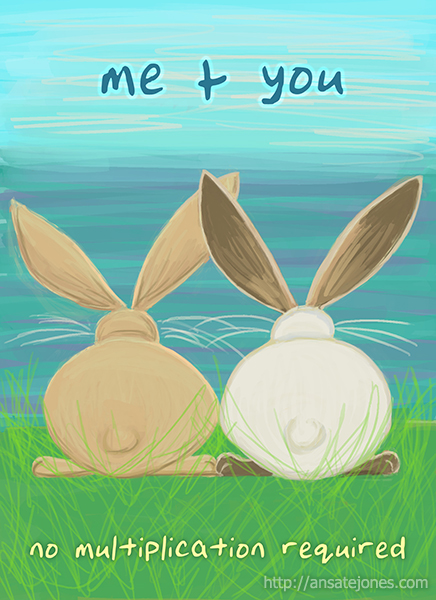 A child-free Valentine's card. The bunnies on the grass by the ocean were inspired by the place my own husband proposed to me, Greenaleigh Beach in Somerset, UK. After that it was simple math. | |