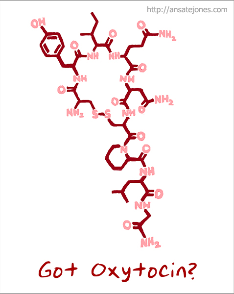 Oxytocin is a 'love' hormone produced by humans and other animals. It's involved in the bonding process between parents and children... and lovers. It was a natural choice for a geeky Valentine's card. | |