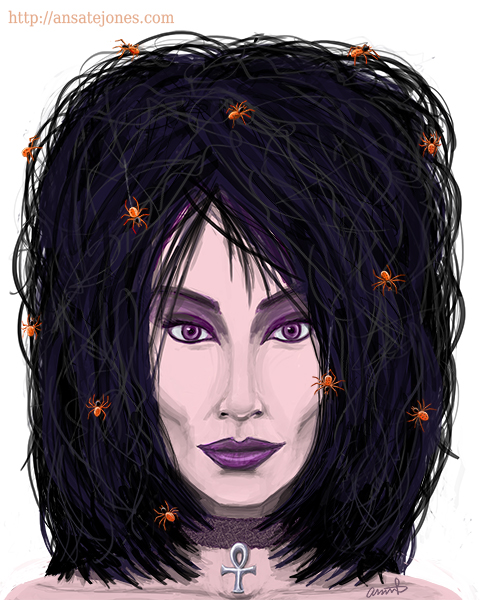 Hair Biome Series #4. The spiders are Crustulina sticta, one of the 'cobweb spiders' in the Theridiidae family. And they're teeny! (digital painting) | |