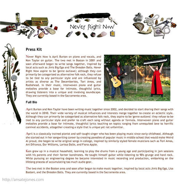 Basic online press kit I put together for my band, Never Right Now. Full kit can be viewed and downloaded here. | |