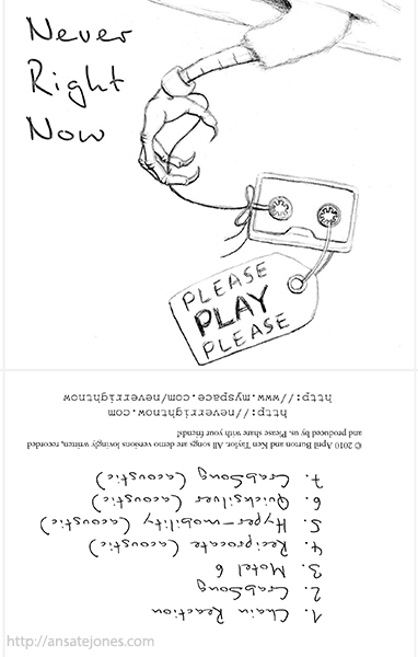 Original CD case art for my band, Never Right Now. We made our own covers for our first CD release and published instructions so that fans who bought digitally could make their own too. Full instructions can be downloaded here (PDF, 428KB). | |